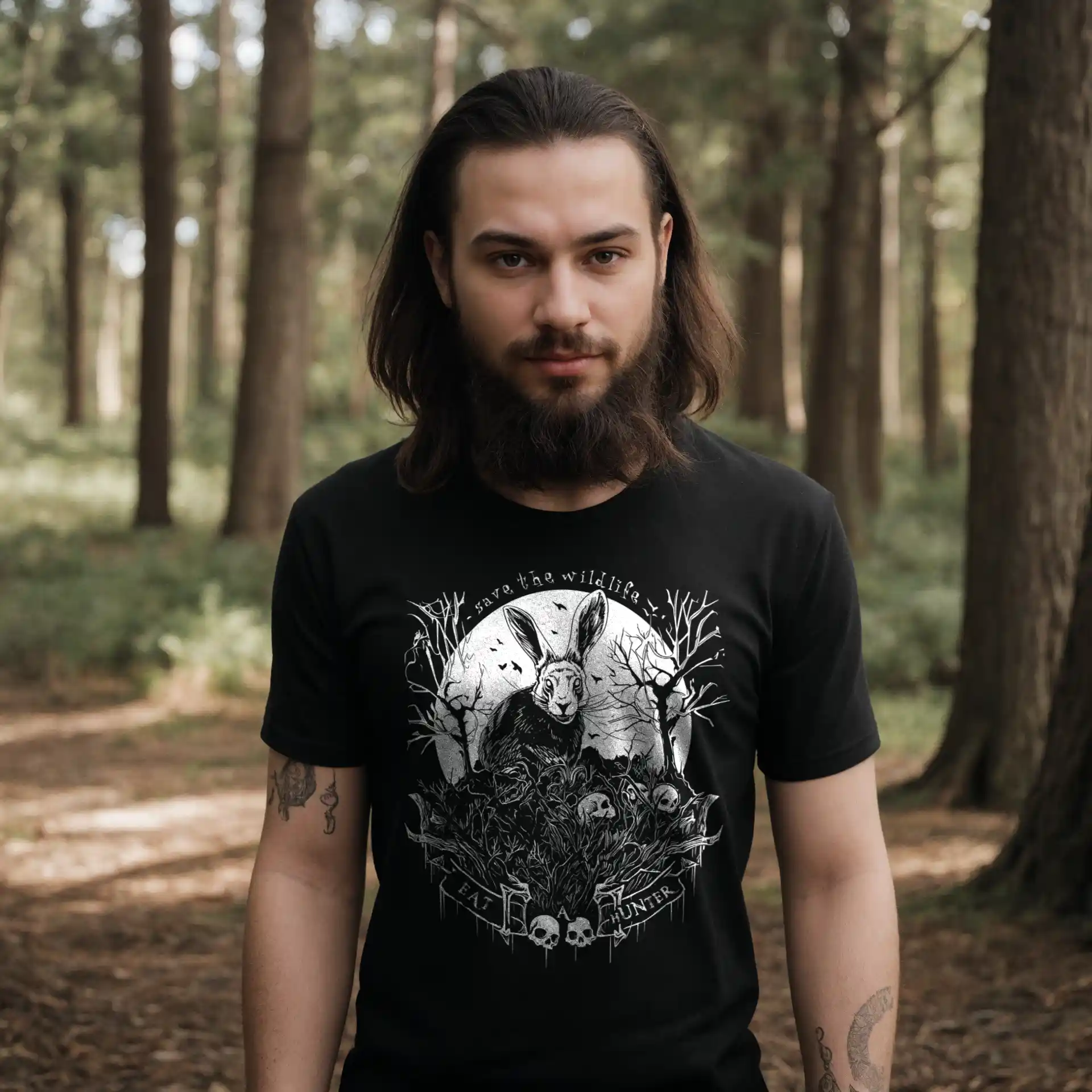 The “Eat a Hunter” design is a powerful cry for freedom and rebellion. A brave rabbit rising up against the hunter symbolizes the untamed spirit of black metal and the determination to fight for what you believe in. The dark branches and skulls in the background remind you that nothing in this world is forever—except the indomitable will that this music ignites.